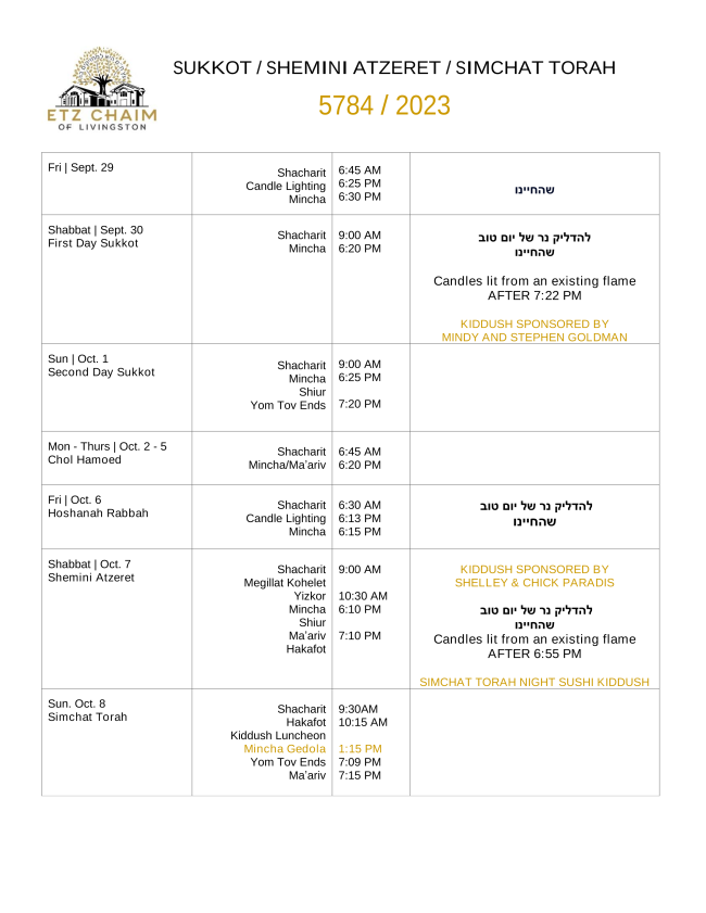 Weekly update of important upcoming times, events, and celebrations. Etz...