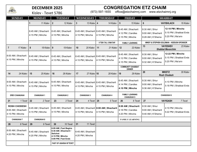 Congregation Etz Chaim of Livingston is more than a house of prayer and of Torah study, it’s our shared home. Etz Chaim is a warm and loving place of Jewish continuity and spirituality, a center of meaningful Jewish life. We are powered by our shared commitment to tradition, Halacha – Jewish law, and the State of Israel. Whether you go to shul every day or only once in a while, you belong here. You’re a member of our family.